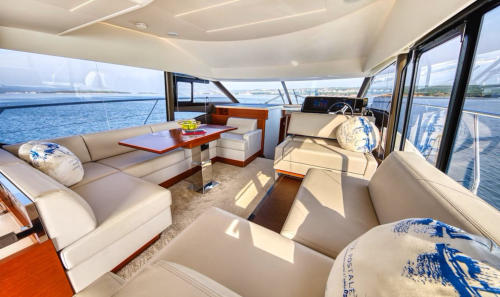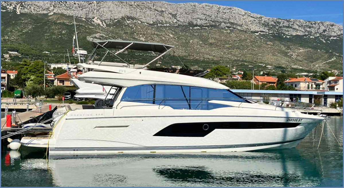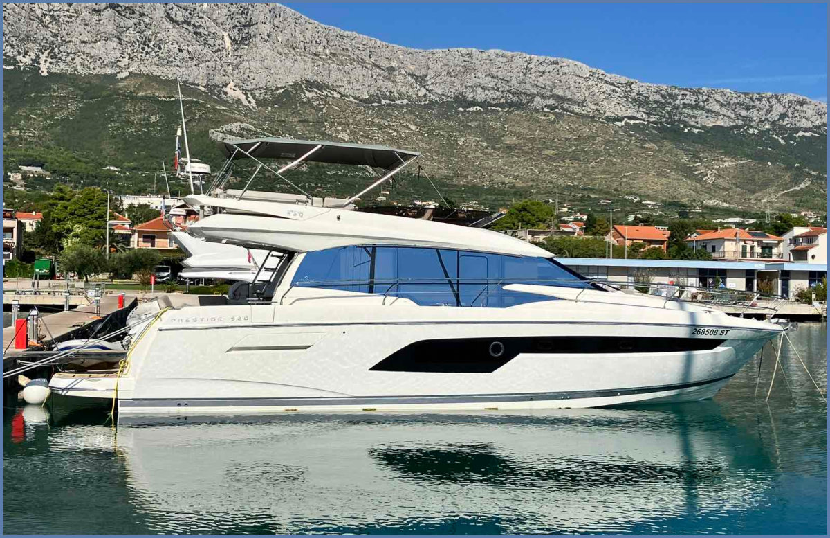 Holidays on your dream yacht MEDUSA! Yacht with top equipment and in almost new condition, ideal for your dream holiday, excellently maintained and serviced and can be booked for experienced boaters without a skipper and, if desired, of course with a skipper and hostess. The 3-cabin motor yacht MEDUSA offers space for up to 6 (8) people in 3 double cabins (and 2 in the saloon) as well as 1 skipper (extra cabin). Pillows and blankets as well as bed linen are provided during the yacht rental. This yacht is operated in Croatia by the charter company EUROMARINE and is stationed in the ACI Marina Split, which can be reached perfectly by plane or, of course, by vehicle. In addition to the XXL flybridge and a very comfortable and spacious saloon and very large windows that perfectly light up the living space, the MEDUSA has 1 master cabin across the entire width of the ship with separate access and bathroom as well as television. In the bow of the ship is the VIP cabin with extendible beds, television and bathroom with full shower. There is a double cabin with push-together beds on the side of the boat, the bathroom is shared with the VIP cabin. 2 toilets with shower, a power generator, barbecue, bimini and bow thruster, IPS drive, complete sun protection at the rear and on all windows. It also offers flat screens, heating, air conditioning, sound system and external speakers, as well as a fully equipped kitchen including microwave, dishwasher, fridge and freezer and oven, extractor hood, water purifier, a washer with dryer, inverter, 3 TB media server, WiFi hub and a dinghy with an 8 HP Yamaha outboard motor. Equipment and description of the yacht MEDUSA Boat model: Prestige 520 Fly Manufacturer: Prestige Yachts Boat type: Motorboat / Motor yacht Year of construction: 2020 Location: Croatia, ACI Marina Split Hull material: GRP/plastic Length: 16.11 m (52.85 feet) Width: 4.49 m Diesel tank: 1300 liters Water tank: 636 liters Waste water tank: 170 liters Hot water boiler: 60 liters Cabins / berths: 3 cabins with 2 berths each Skipper's cabin with its own toilet room If required, 2 additional sleeping places in the salon Maximum number of sleeping places: 6 (8) and skipper's cabin Engine: Volvo Penta IPS 650 D6 with joystick, engine power: 2 x 353 KW/480 HP with joystick Fuel: Diesel Drive: IPS/Pod drive Other: Flybridge Dinghy: new with 8 HP Yamaha engine included Only for experienced boaters, can be booked without a skipper